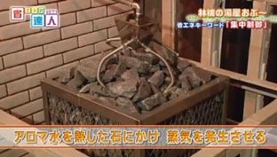 室内にある石が気になった柏木調査員。これはアロマオイルを入れた水を熱した石にかけ蒸気を発生させる設備で、いい香りを楽しめるのが人気の秘密です。